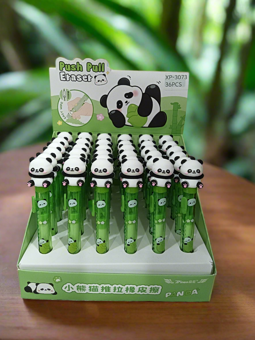 Push-pull retractable erasers, each with a different design theme: Panda Design: The top box contains green-colored erasers featuring a panda design. Space Design: The middle box...