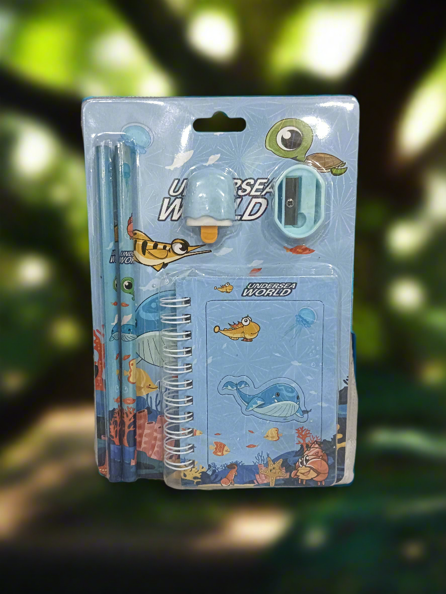 Stationery set, likely designed for children. It includes: Two pencils A sharpener A small notebook Eraser Stationery sets are collections of writing and drawing tools, often packaged...
