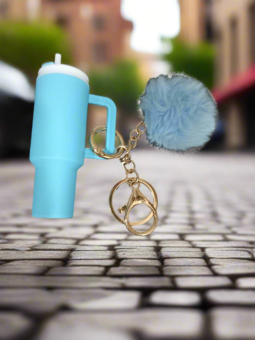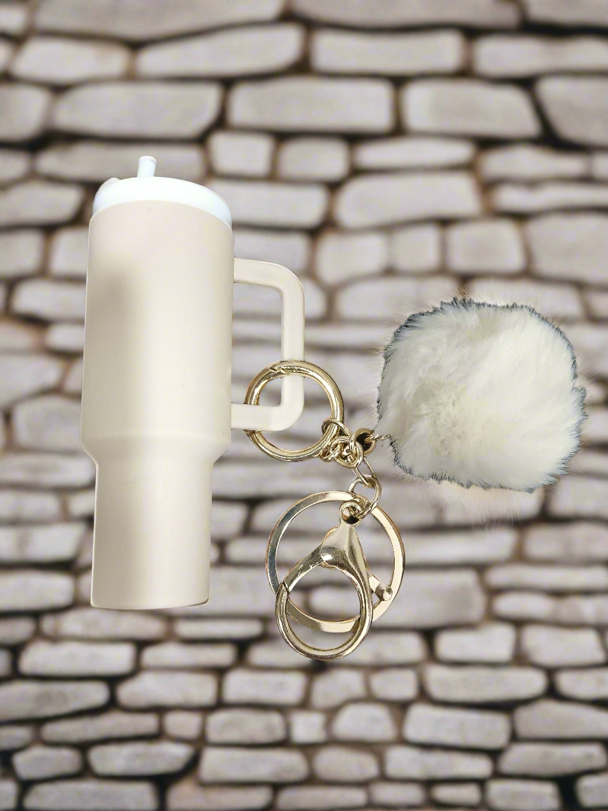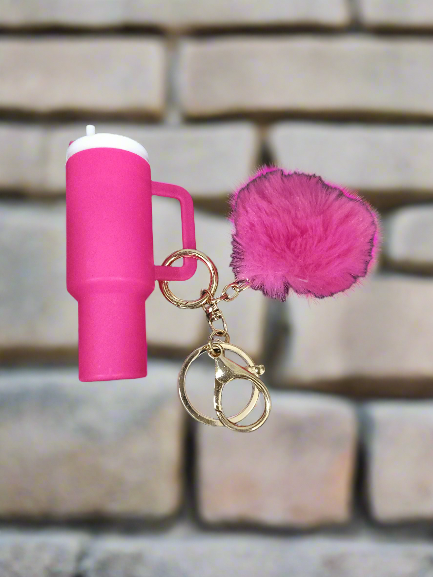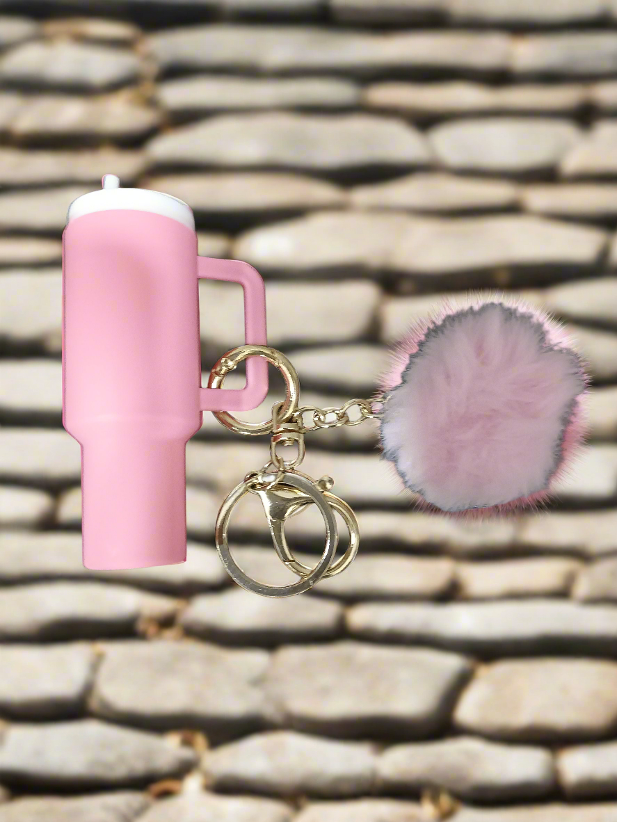 Mini tumbler keychain with a pom- pom charm. These keychains are designed to mimic the look of popular tumblers, such as the Stanley cup, and are often...