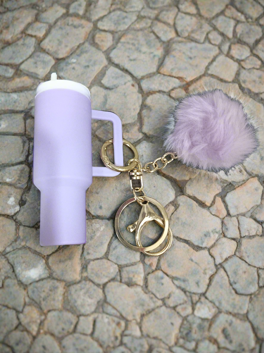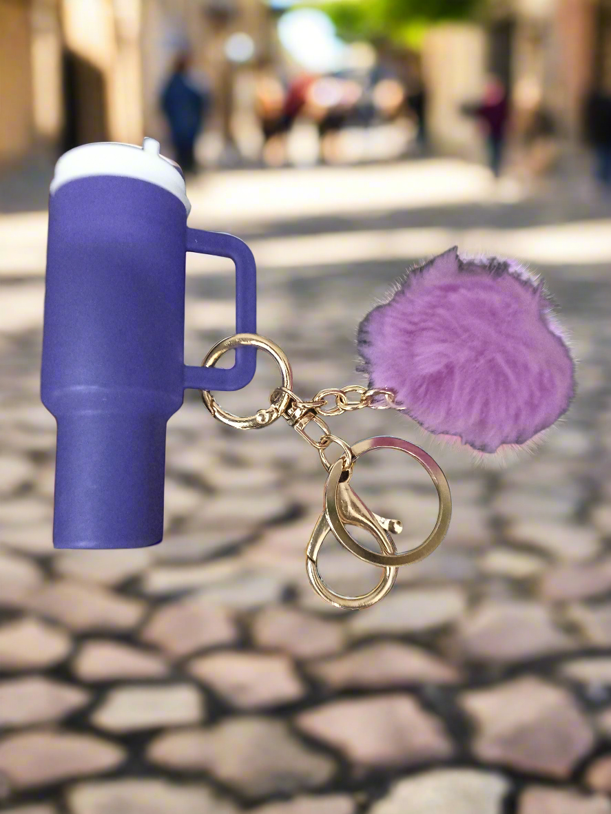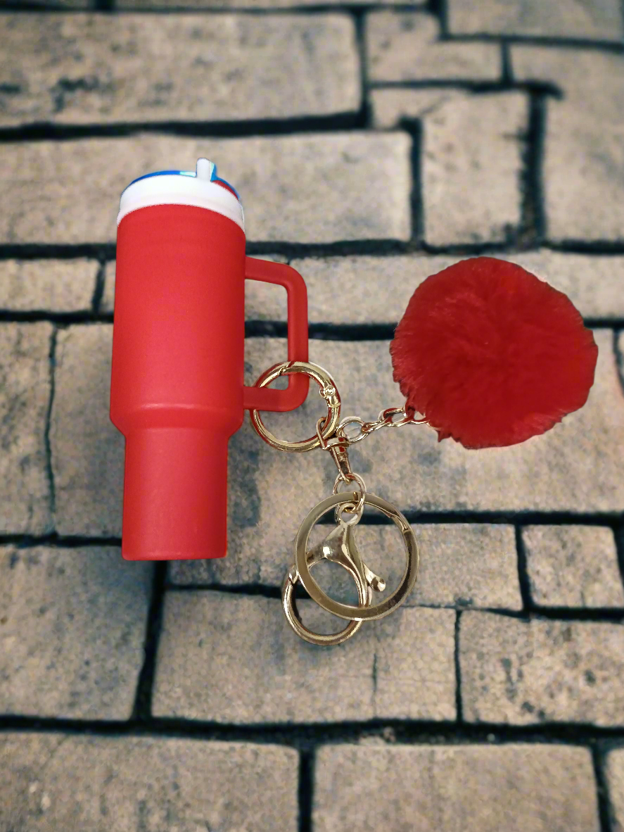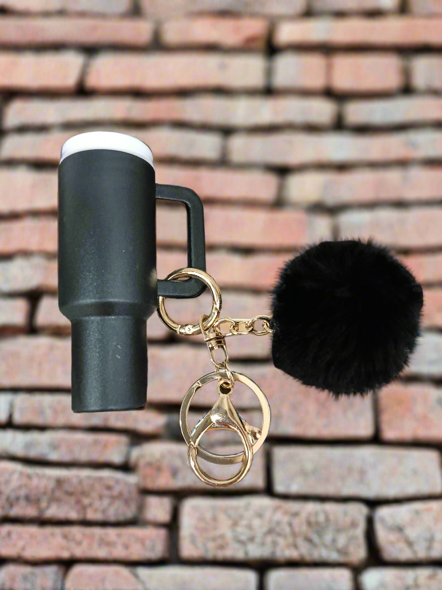 Mini tumbler keychain with a pom- pom charm. These keychains are designed to mimic the look of popular tumblers, such as the Stanley cup, and are often...