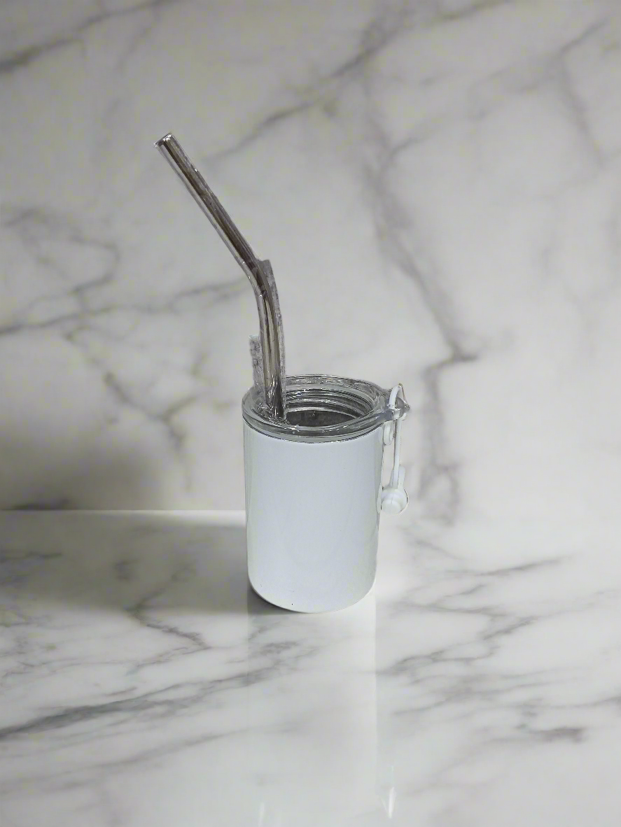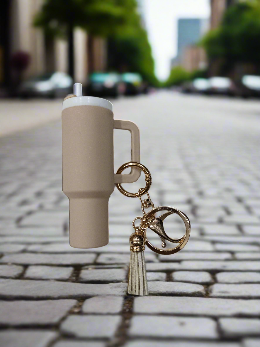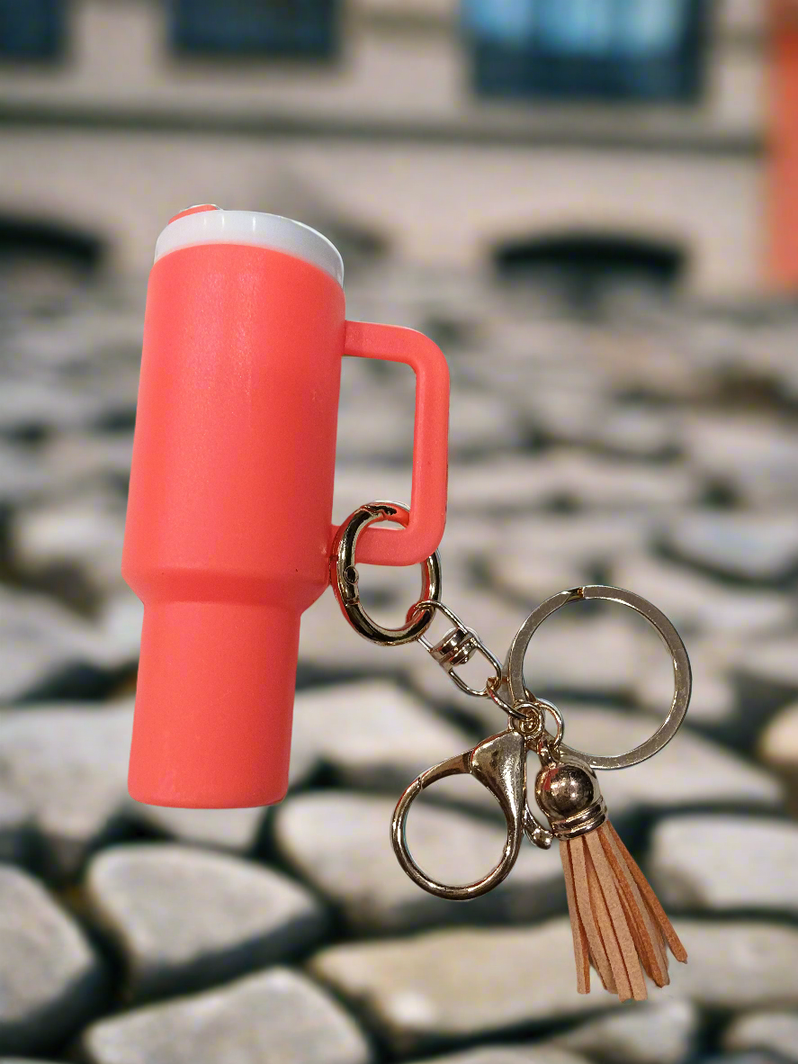 Mini tumbler keychain with a charm. These keychains are designed to mimic the look of popular tumblers, such as the Stanley cup, and are often used as...
