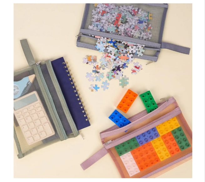 - Unique Design: Our Mesh Zipper Pouch Bags feature a double-layered design, allowing you to separate and easily locate different items. One layer can hold Books, while the other can store stationery and accessories. Each bag comes with a sturdy handle for easy carrying and hanging.