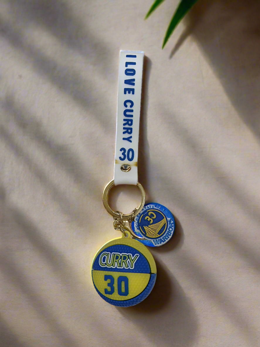 basketball-themed keychains, each featuring a different NBA player and their respective jersey number and team affiliation: