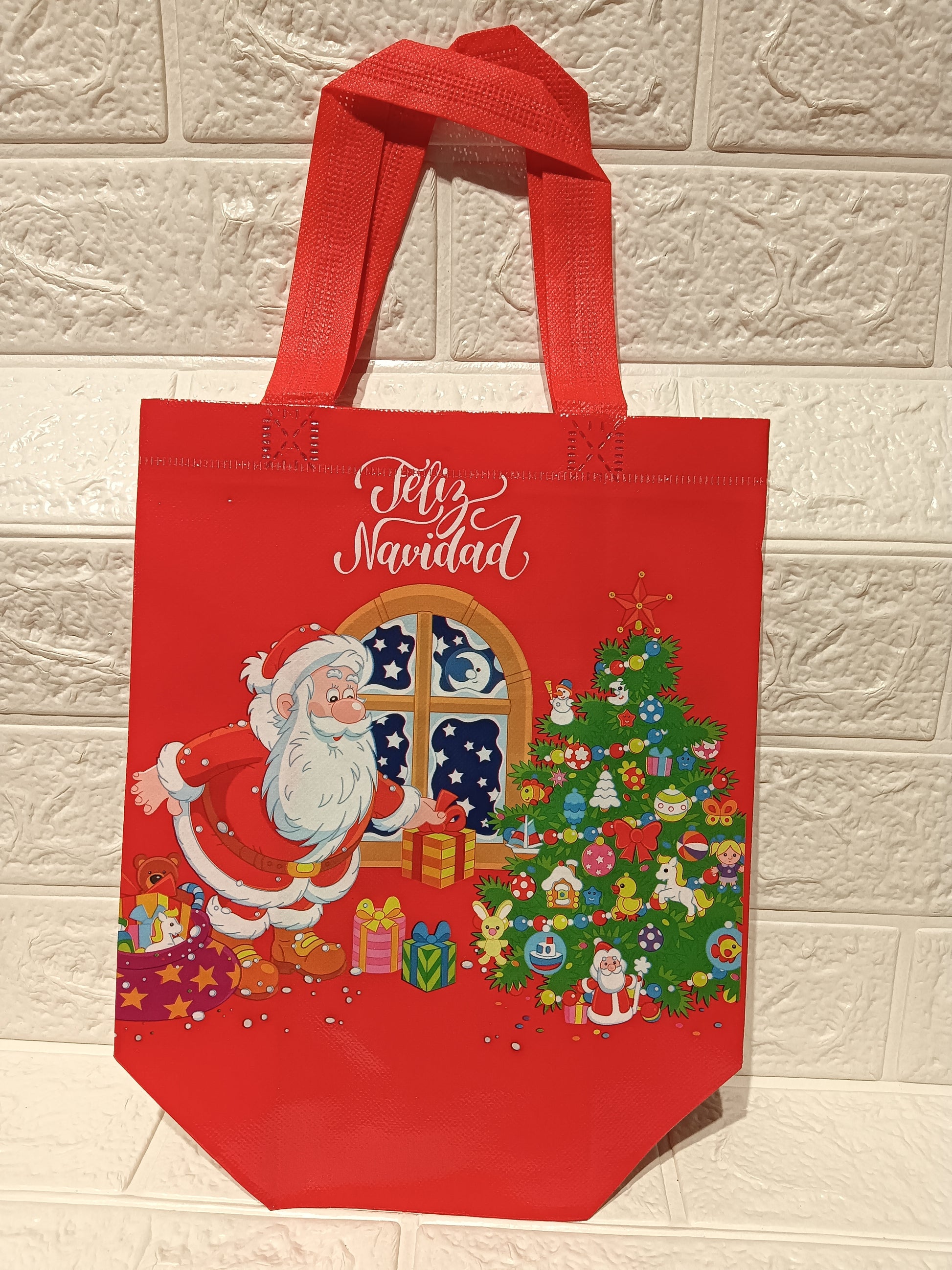 - The bag features a festive design with Santa Claus, elves, and a snowman in a winter village scene.