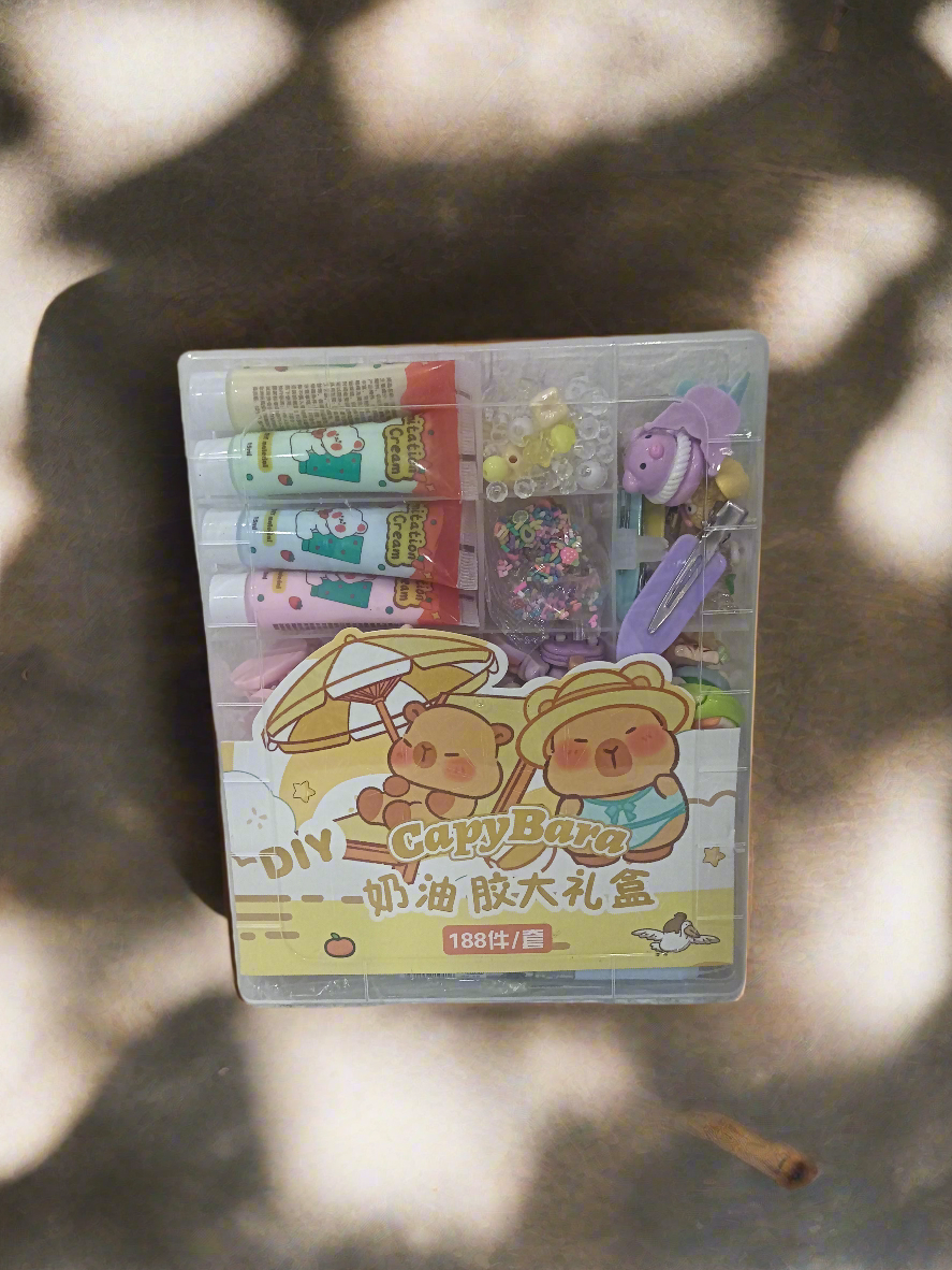 Contents:The kit includes various crafting supplies, notably "cream glue" (likely a decorative adhesive that mimics whipped cream) and stickers or embellishments.