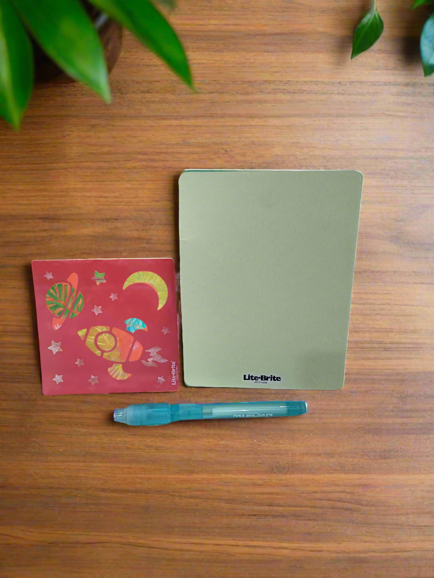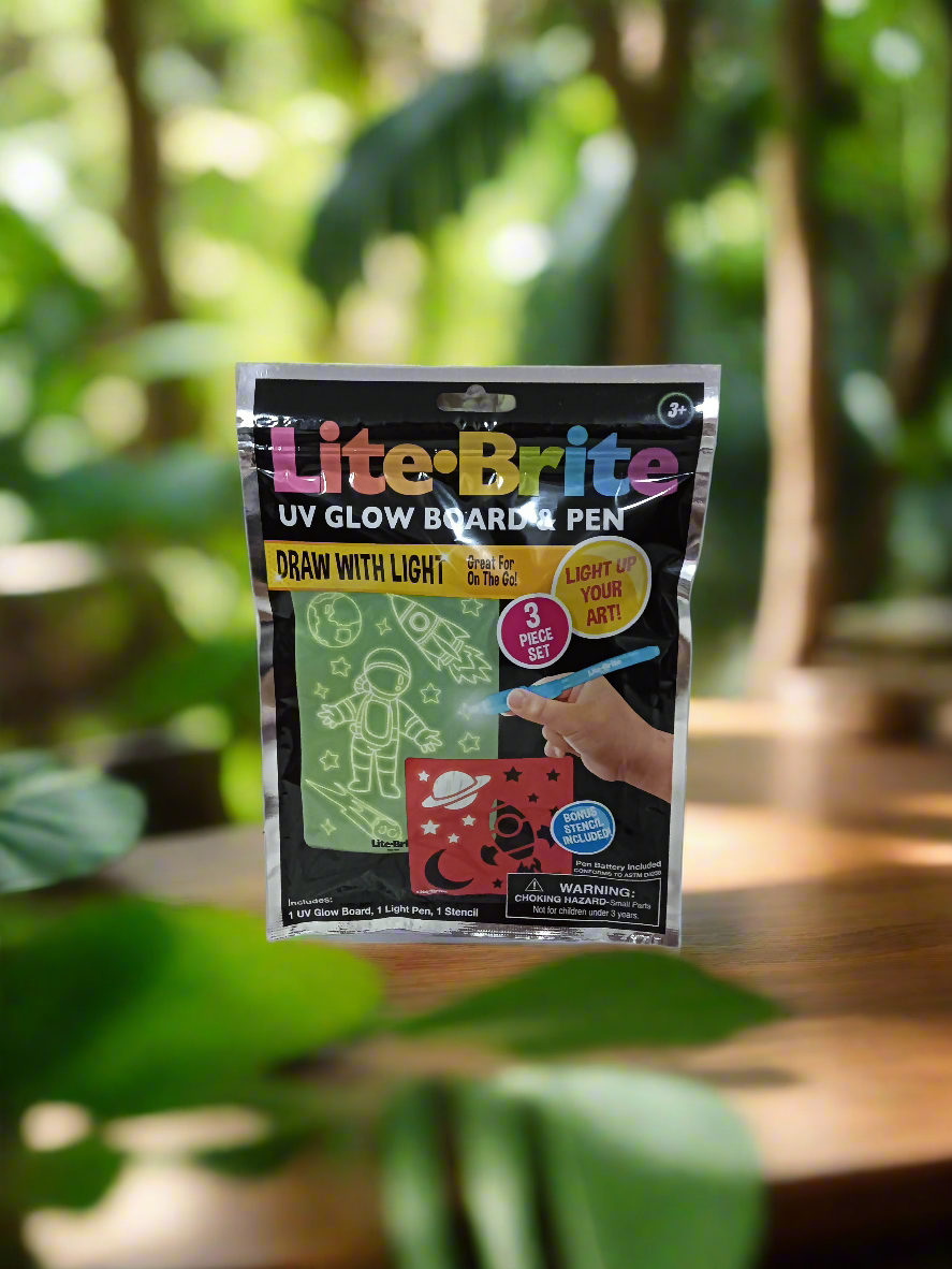 - It's a "3 Piece Set" and includes a UV Glow Board, a Light Pen, and a Stencil for creating illuminated artwork.