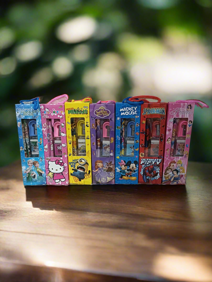 - Each pack contains 1 Fancy Box, 2 pencil, 1 scale, 1 sharpener, 1 eraser