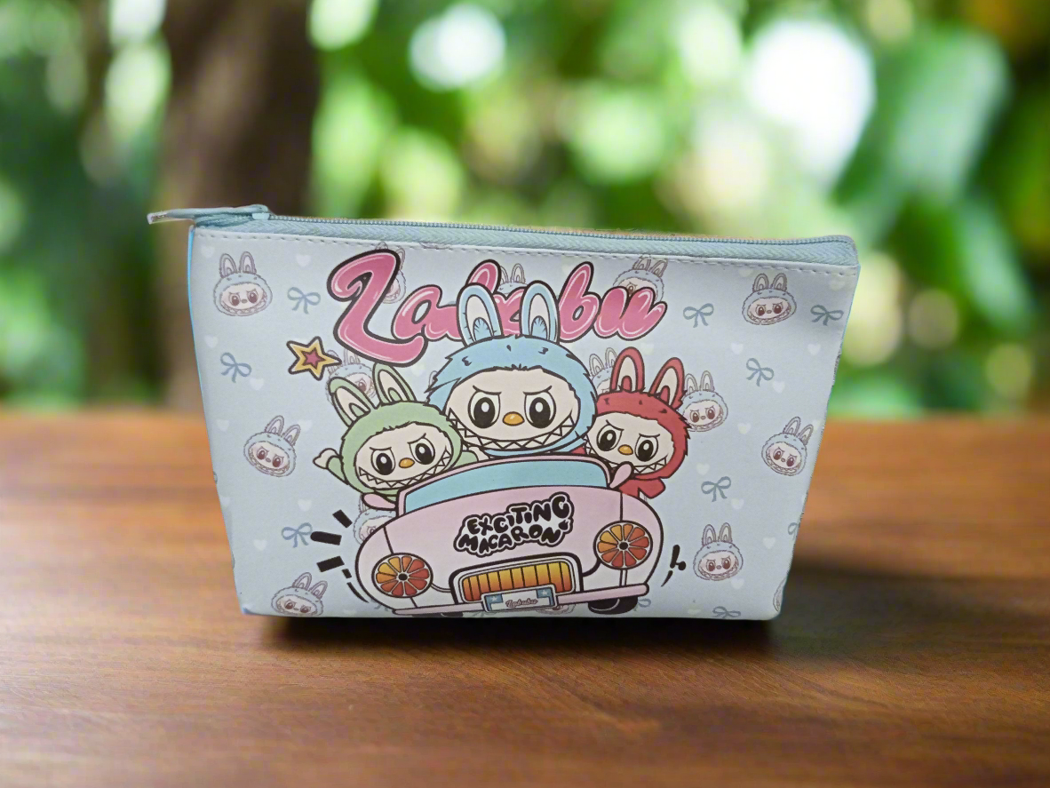 The pouch shown has a light-colored background with a pattern of smaller Labubu faces and features a larger illustration of Labubu characters .
