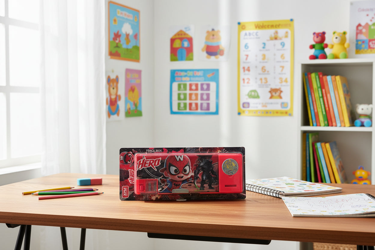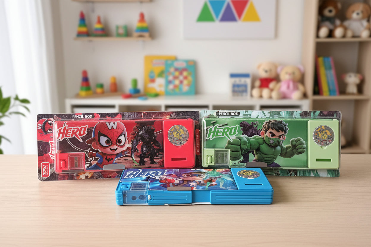 ⭐ Attractive hero-themed geometry box with built-in piggy bank